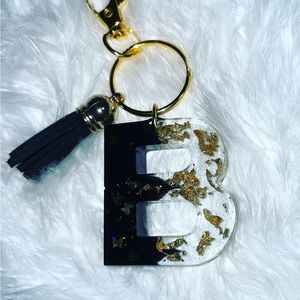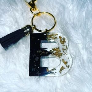 Butterflies are strategically placed on the black letter "B," creating a beautiful contrast between the dark background and clear w/ shimmering gold butterflies arranged in a way that appears balanced and visually pleasing.