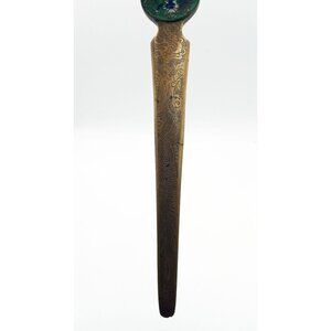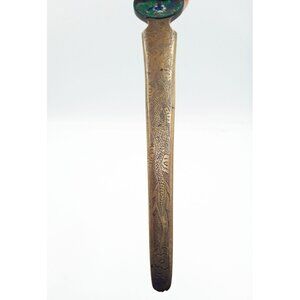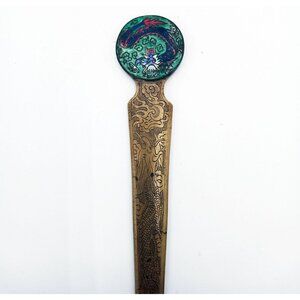 This vintage letter opener has an intricate dragon design on both sides. One side is colorful; the other engraved with the image of a dragon. The round vibrant enameled handle adds a touch of elegance to any desk.