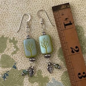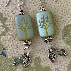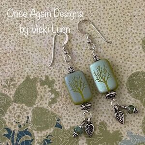 “Letting Go” - Dangle Earrings Hand Created - Once Again Designs by Vicki Lynn Limited edition earrings. This Pair: - Czech glass beads in an iridescent green featuring a tree and branch silhouette. - Mini Czech glass beads. - TerraCast findings and leaf charms representing the promise of new growth. - Sterling silver French hook ear wires with sterling silvery bead. - Length: Approximately 2-1/2” from top of ear wire. - Packaged in a handmade drawstring pouch in a complimentary design and color of my choosing. Perfect for gift giving and storage. Care: Please remove before bathing, showering, or swimming to avoid damaging beads and metal finishes. 🔷 non-smoking and pet free home 🔷 bundled items of 2 or more will be discounted accessory, artisan, artistic, artsy, boho, bohemian, chic, Czech glass, dangle, drop, earthy, gift, hand crafted, hand created, handmade, jewelry, limited edition