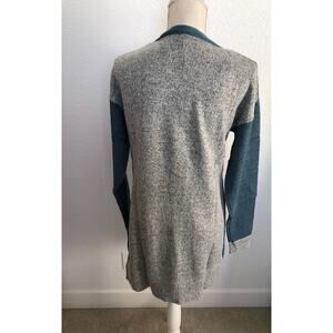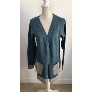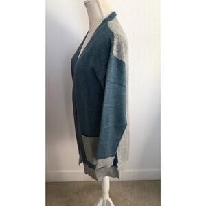 This open-front cardigan is lovely it comes in blue and light gray. The front has two gray pockets that accent the blue. In contrast, the back is a gray panel. The color blocking gives this cardigan a cool style. It hits about mid-thigh. New with tags.