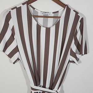 Apprpximate measurements in photos. Alot of stretch. Fun stripes can be dressed up with sandals, boots and jean jacket or even sneakers. Such a versatile dress. Like a mocha brown and white stripes. Casual, daily wear and comfy.