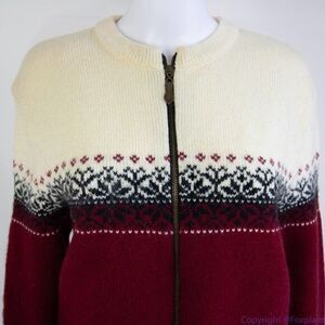 Women's 100% wool nordic fair isle red white full zip cardigan sweater by Levandi, size XL