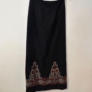 Levantis Nikis 3 of Athens vintage maxi skirt, measurements, waist 24 inches from side seam to side seam; 41 inches long. There isn't any size label, but it must be a size S. Elaborate stitching in rust and white with silver flex circle the bottom of the skirt. The fabric content feels like wool or linen but there isn't a label for fabric content. Black slik lining on the inside of the skirt. This is an elegant piece of clothing, very well made. It's used but in great vintage condition.