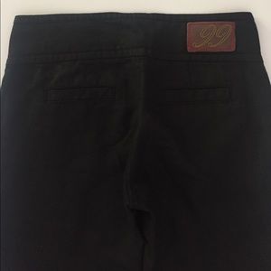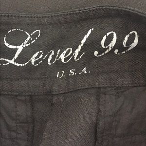 Black Linen cropped gaucho has a 3" wide belt. Curved slant side pockets. Fly closure with parallel rows of black buttons adding a nautical look. Two button function as waistband closure. Two false back pocket detail. Inseam - 16-1/2". Waist from side to side - 14-1-2". In Excellent hardly worn condition. Dry cleaned only.