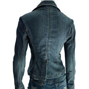 A rare find from premium LA denim brand Level 99, popular in the mid-2000s for its tailored denim. This blazer reflects the late Y2K/early 2010s style moment β cropped 20β length, tailored seams, and flap pockets. Designed in stretch cotton-spandex for a flattering fit.