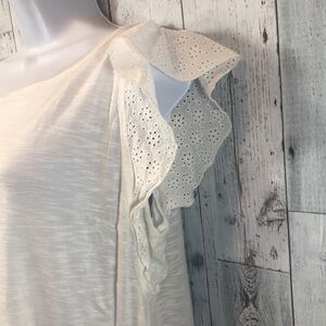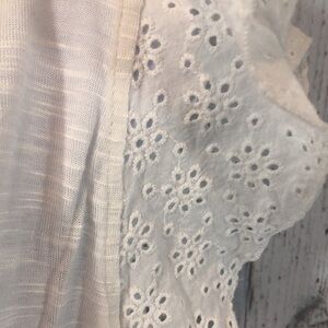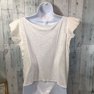 Off white, eyelet lace cap style sleeves, lightweight, colors may vary due to lighting, good used condition, Sz: M