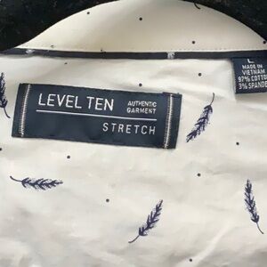 Level Ten buttoned down shirt. Dark blue with feather print. Buttoned down and collared. Long sleeves. Excellent condition. A stylish top and perfect for an evening out.