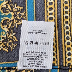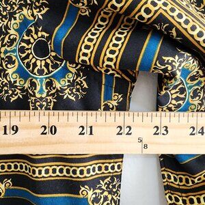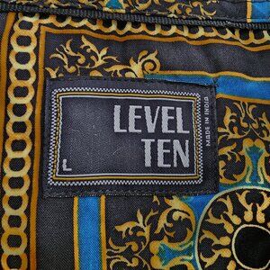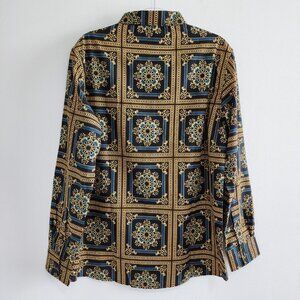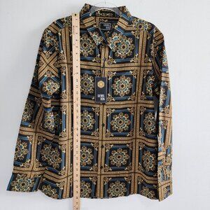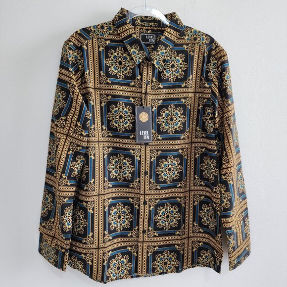 NWT Level Ten Gold Baroque Print Long Sleeve Button Down Shirt — Black Teal in size L - Y2K, glam baroque, maximalist, opulent, retro luxe. Perfect for nights out, upscale parties, clubwear, and fashion events.