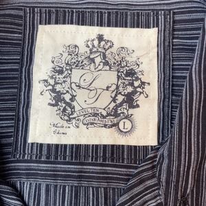 This Level Ten button-up shirt for men in size L features a blue striped pattern with a spread collar neckline and long sleeves. It has a button closure and is made of woven cotton fabric that is machine washable. The shirt showcases an eagle graphic with a crown on it, adding a touch of unique style to the overall design.