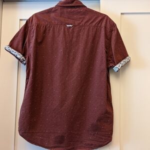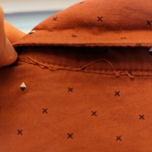 Good Condition button up shirt with detailed edging along the buttons and cuff. There is some off stitching along the collar on the back...see pics.