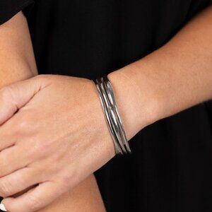 Hammered silver bars layer across the wrist, coalescing into an edgy urban cuff.