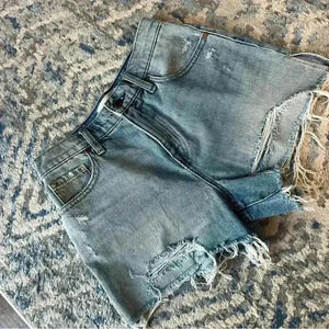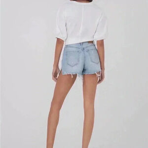 High rise cut-off fray short shorts that hug comfortably at the waist but looser around the hem. Cut in 100% cotton denim, Bon Voyage is a vintage light bleached blue wash.