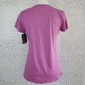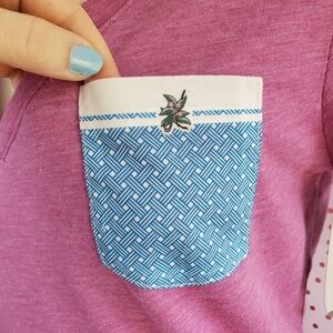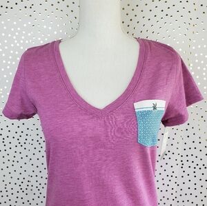 Levelware Melody Tee in Heather Mulberry. Jersey knit with slub texture. Cute blue and white gentle weave front pocket. 65% Polyester, 35% Cotton. Medium