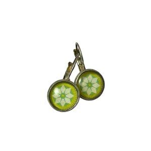 Leverback Earrings Green Geometric Star Pattern Silver Tone