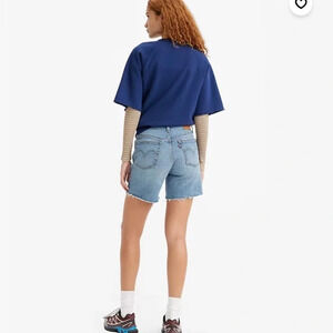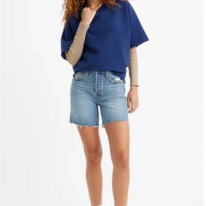 Mid-thigh length. Dark wash. Raw hem. Good preowned condition.