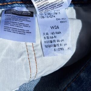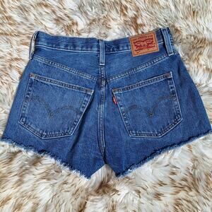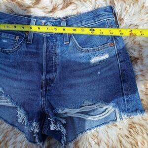 in excellent condition size 26 high rise button fly 501 original fit jean shorts with factory distressing absolute summer essential super flattering