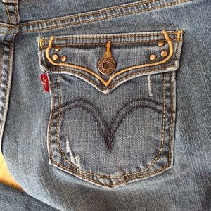 Bootcut, supposed to be distressed in some areas, inseam is 30 in, rise is 9 in, waist is 29in. Decorative back pockets with buttons