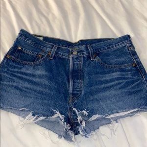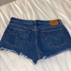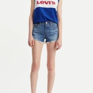 Levis high wasted short in medium blue wash. Button up front, vintage fit and style.