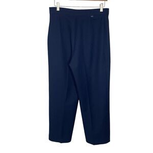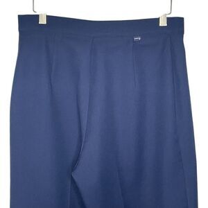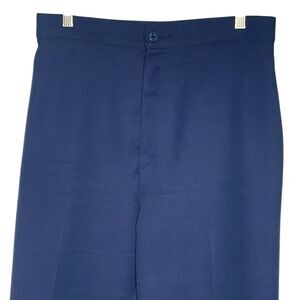 The product is a pair of vintage Levi Strauss navy blue tapered leg polyester pants in size 16. These dress pants feature a solid pattern, zip closure, high rise, and a regular fit. With a flat front and 29-inch inseam, these machine washable pants are perfect for women looking for a stylish and comfortable wardrobe staple. The vintage Levi's brand adds a classic touch to these versatile pants that can be dressed up or down for any occasion.