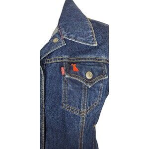 The Levi Strauss & Co Denim Trucker Snap Front Jean Jacket in women's size large is a classic and versatile piece for any wardrobe. Made from durable 100% cotton denim with a solid blue color, this jacket features long sleeves and a snap closure for a casual and easy-to-wear look. The regular fit and basic jacket style make it perfect for all seasons, while the iconic Levi's brand and timeless design add a touch of nostalgia. With accent details like pockets, this denim jacket is a must-have for any fashion-forward woman looking for a stylish and comfortable outerwear option. Comes with a little red dress pin, easily removed, jacket worn once for photo.