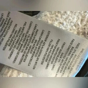 The mid-length jacket is a size XS, regular fit. There are 4 front pockets (two at chest) and a inner cord to cinch the waist. It has both a zipper and snap closure.