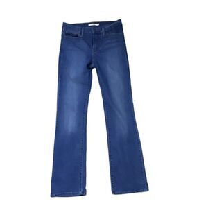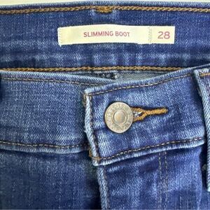 Levi Strauss & Co presents the Women's Slimming Boot in size 28, a medium dark wash. Made with premium cotton for ultimate comfort and durability, these jeans offer a flattering, slimming fit.
