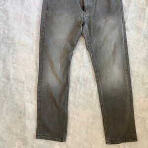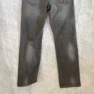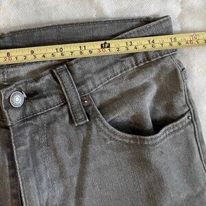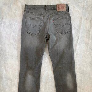 Classic Levi Strauss jeans in a medium washed grey tone. Lightly worn with original size logo tag on waist and interior pocket. Size is listed as 30W and 30L. 99% cotton, 1% elastane traditional weight fabric.