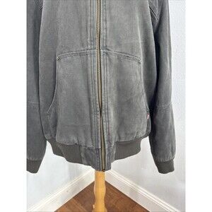 This Levi Strauss jacket is designed for men in size XL. It is made of gray canvas with sherpa lining, providing warmth and comfort. The jacket features a hood, full zip closure, and a classic bomber style with button and zipper accents. It is suitable for various occasions like travel, parties, casual wear, or even for workwear. This versatile jacket combines a rugged look with practical features, making it a stylish and functional addition to any wardrobe.