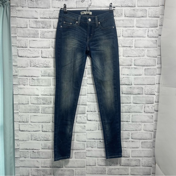 Dark blue with faded areas, 5 pockets, zipper and button closure, belt loops, low rise, back of leg near hem is faded see pictures, colors may vary due to lighting, good used condition, size 26x30