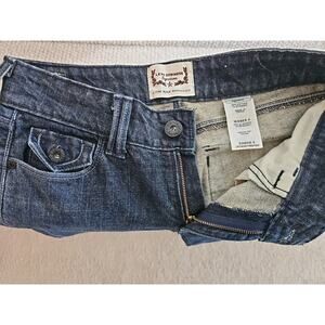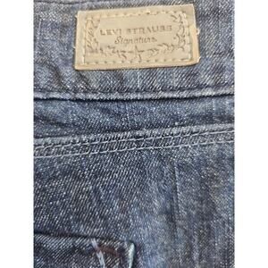 The product is a pair of Levi Strauss Signature Jeans in a vintage style, featuring a low rise, bootcut design in a classic blue denim color. Made with a stretch denim fabric blend of spandex and cotton, these jeans have a 30-inch inseam and a 29-inch waist size. They are accentuated with a zipper closure and a 5-pocket design, suitable for everyday wear. The signature by Levi Strauss & Co. brand ensures quality and style, perfect for a casual yet trendy look. Ideal for the fall and spring seasons, these jeans are a timeless addition to any woman's wardrobe.