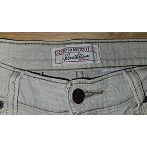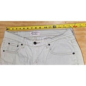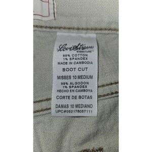 The product is a pair of Levi Strauss Signature Stretch Bootcut Jeans in Misses Size 10 Medium. These solid beige jeans feature a zip closure, medium wash, and are made of denim fabric with a stretch for added comfort. The mid-rise jeans have a regular fit and 5-pocket design, perfect for the winter, fall, and spring seasons. The Levi's brand ensures quality and style, making these jeans a versatile addition to any woman's wardrobe.