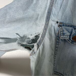 Super cool vintage Levi button down! Flaws are pictured. This is a casual shirt that would look great over a tee shirt to add a cool vintage edge. There are little holes around front pockets and a large hole in one armpit. There is light brown staining on back inside collar. Smells great. Great faded blue color.