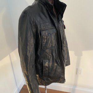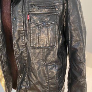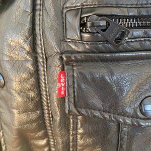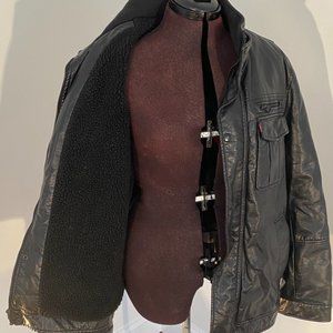 This vegan leather jacket is a levi size large. It has teddy borg lining for warmth and extry comfort. There are pockets on breast and sides. Has a zip closure and high neck that can be folded down as a collar.