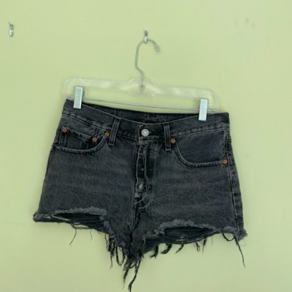 Black denim shorts, button fly, thick denim material, No size tag but I would guess a 28