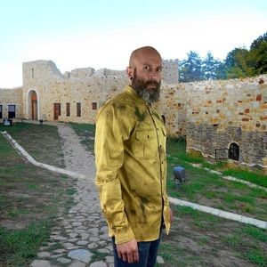 “Leviathan” Shipwrecked Custom Button-up Size Medium. 97% cotton 3% Spandex. Originally manufactured for Lands End. Effects by @goodtreaasures. Colors Army Green and Yellow/Gold.