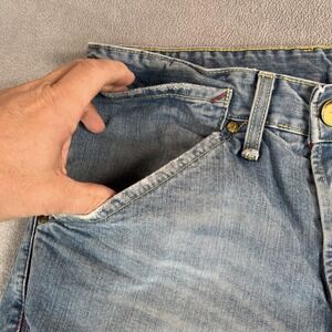 Condition: Good used condition with moderate wear. Some fraying at hem and small distressed spot on back pocket as shown in photos. Pocket tab has unique contrasting fabric and snap closure detail.