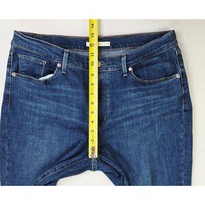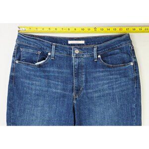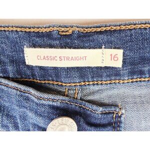 The product is a pair of Levi's women's classic straight 5-pocket jeans in size 16 with a mid rise and a 30-inch inseam. They feature a zip closure, button accents, and are made of denim fabric with a dark wash. The jeans have a logo tag, stretch fabric, and come in a solid blue color. They are machine washable and have a 5-pocket design with a coin pocket. The brand is Levi's, and the style is straight, perfect for all seasons.