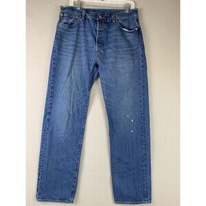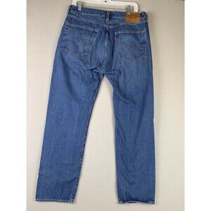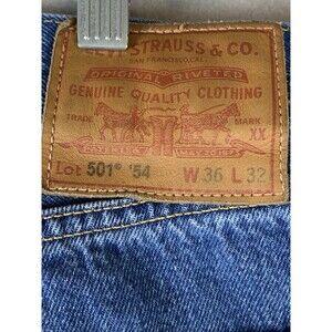 The product is a pair of Levi's 501 '54 Men's Jeans in size 36x32 (34x30) inches, featuring a blue denim fabric with a button fly closure. The jeans have a classic straight fit and a 5-pocket design, making them comfortable and easy to care for. They are machine washable and made of cotton, with a dark wash and solid pattern. The design of the jeans incorporates elements from various themes such as school, rock, cowboy, 80s, 90s, and retro, making them a versatile and timeless wardrobe staple for any season.