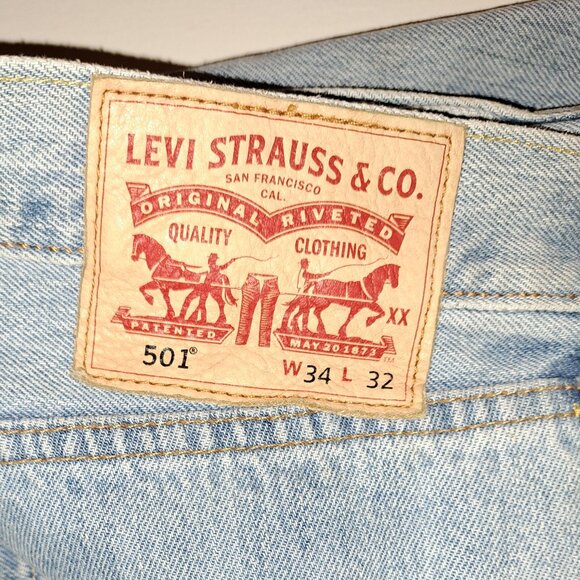 34x32 button fly Levis 501. These are old school Levis denim with no stretch. In almost perfect condition. Ankles have been cuffed, so they are more suited to a 30inch inseam.