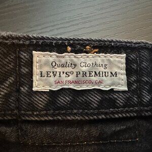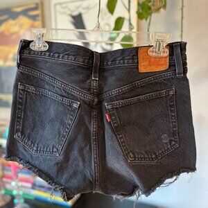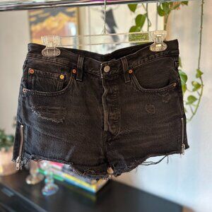 Black/distressed Levi's – 501 DIY High Rise Button Fly Shorts with side zips. The zips work great and can slide up or down depending on how much leg you're feeling that day!
