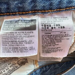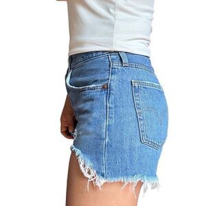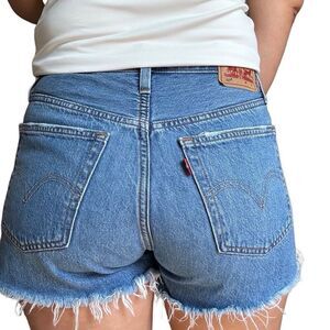 New without tags Levi’s 501 blue Jean shorts in size 27. Distressed frayed hem, short inseam, high rise. Button fly closure.