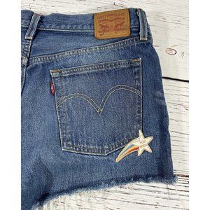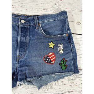 Levis 501 Blue Jean Shorts Patches Womens Size 31 Mid Rise Denim 2.5” Inseam