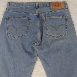 Levi's 501 Men's Blue Light/Medium Wash Five Pocket Six Silver Button Front Closure Straight Leg Denim Jeans. 100% Cotton. Spot On Back Pant Leg. Size. W/38-L/32. Color May Vary Due To Lighting.