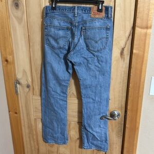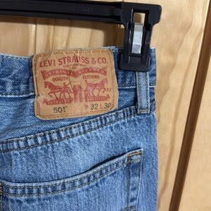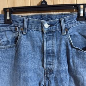 Levi’s Button Fly 501 medium wash jeans. Upgrade your wardrobe with these classic blue denim jeans. Perfect for any casual occasion, these jeans offer both style and comfort.