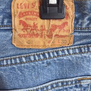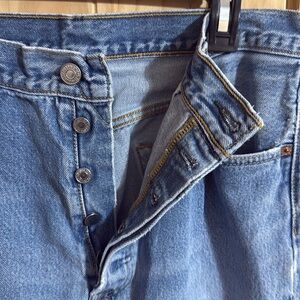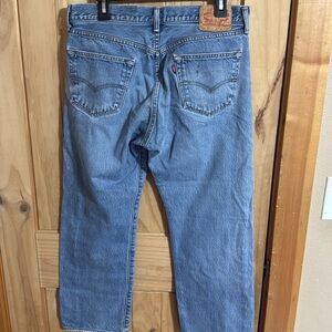 Upgrade your wardrobe with these classic 501 Button Fly blue men's jeans. Perfect for any casual occasion. Distressed, small stain, knee showing wear.