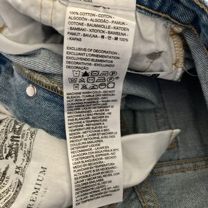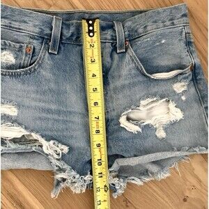 The product is a pair of Levi's 501 button fly cut-off shorts for women in size 27. Made from 100% cotton denim, the shorts feature a high rise waist, a 5-pocket design, and an inseam of about 2 inches. The distressed bodycon style adds a unique and edgy touch, with a solid blue color and accents including leather labels and buttons. Perfect for casual occasions and travel, these shorts are a versatile addition to any wardrobe, fitting a variety of styles from western to grunge to hippie. Ideal for all seasons, they are machine washable for easy care.