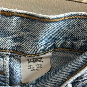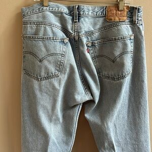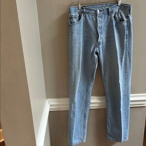 Levi’s 501 Button Fly Jeans 38 X 34. There is wear—especially at the bottom of hems—see last photos. These were well loved Levi’s that are super soft and worn! They are now a very light color from years of fading(originally a medium wash). The actual color is closest to the lighter photos