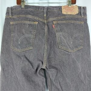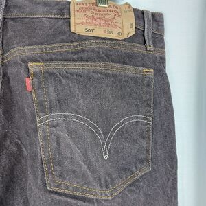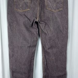 Up for sale is a pair of Levi's 501 button fly jeans in washed brown. These men's jeans have a relaxed fit and straight style, with a mid-rise waist and 30-inch inseam. The fabric type is denim, and it features a distressed look with the Levi's logo as an accent. The closure is a combination of a zip and button, and it comes in size 38 and barrel opening of 9.5 inches.