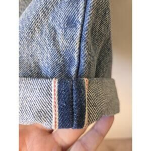 Love these jeans! The Levi's 501 CT Selvedge Stacked Patchwork Jeans in women's size 27x32 are a stylish and unique addition to any wardrobe. These distressed style jeans feature a classic button closure, mid-rise fit, and 5-pocket design with a cropped inseam. Made from 100% cotton denim, these jeans showcase a patchwork design with a blue color that is perfect for any season. The Levi's brand ensures quality and durability, making these jeans a fashionable and timeless choice for any casual outfit.