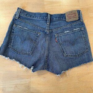 Levis 501 Cut off Shorts Womens Blue Denim Medium Wash Fringe Fray Button Sz 27